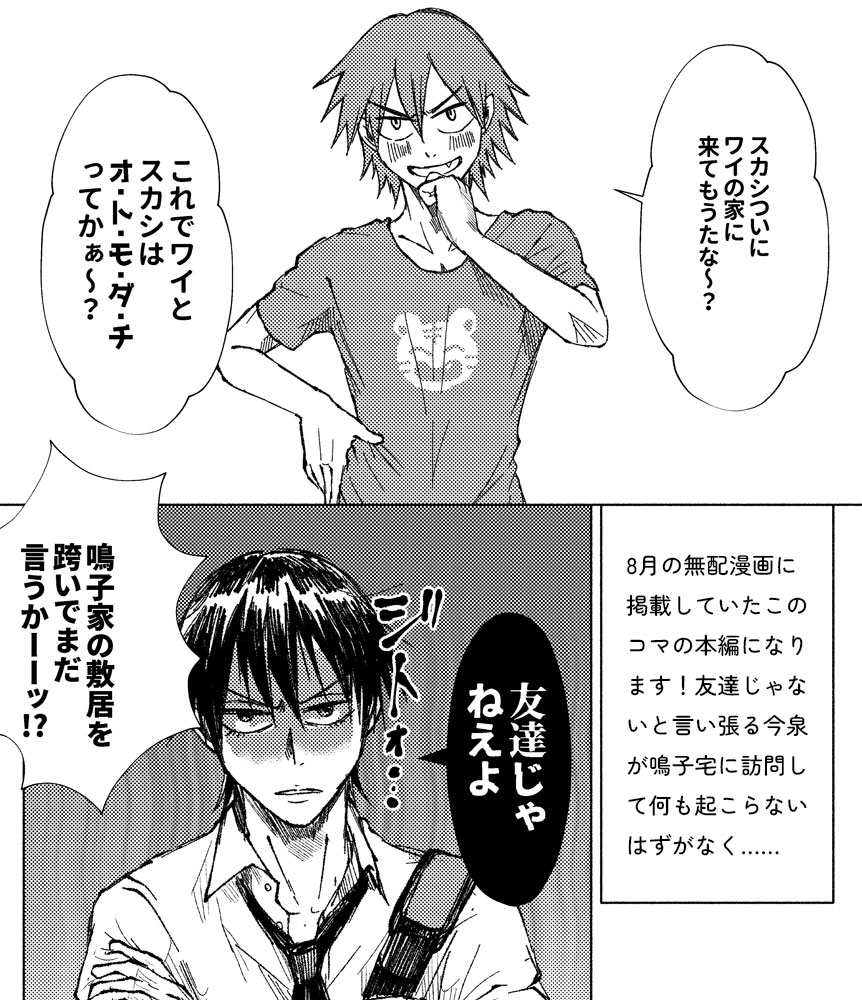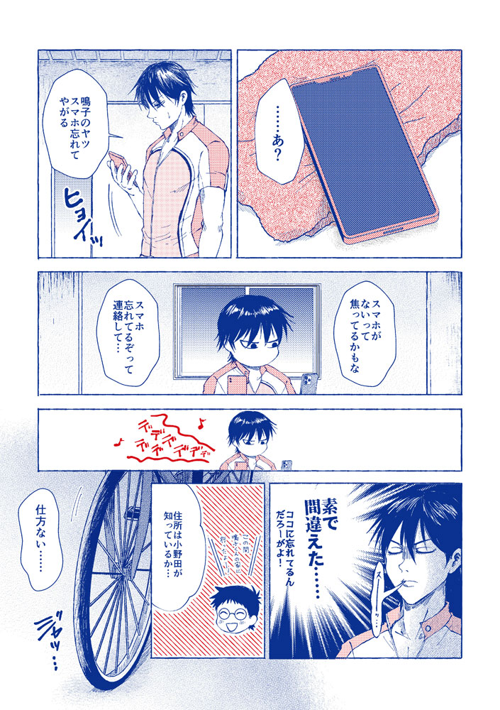 『二進も三進も』 全年齢/A5/20ページ予定/表紙・本文2色刷り 3/17東京の全開ケイデンスで発行予定です。 あらすじ 部室で鳴子のスマホを見つける今泉。しぶしぶ鳴子宅まで届けに行くのだが、何気に鳴子宅に初訪問の今泉、何も起こらないはずがなく… ※鳴子ファミリーをめちゃくちゃ捏造しています。 本文も2色刷りの予定ですが、どんな感じに印刷されるかまだ分かりません。