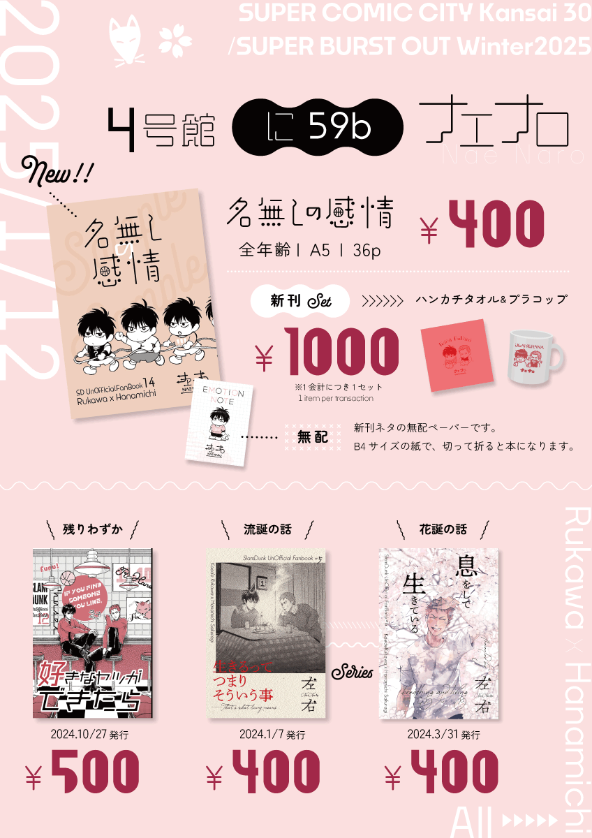 お品書きにある通りで、新刊、手洗いうがいセットのグッズ(ハンカチタオル&プラスチックコップ)があります。2/9のイベントにも持って行く予定です。